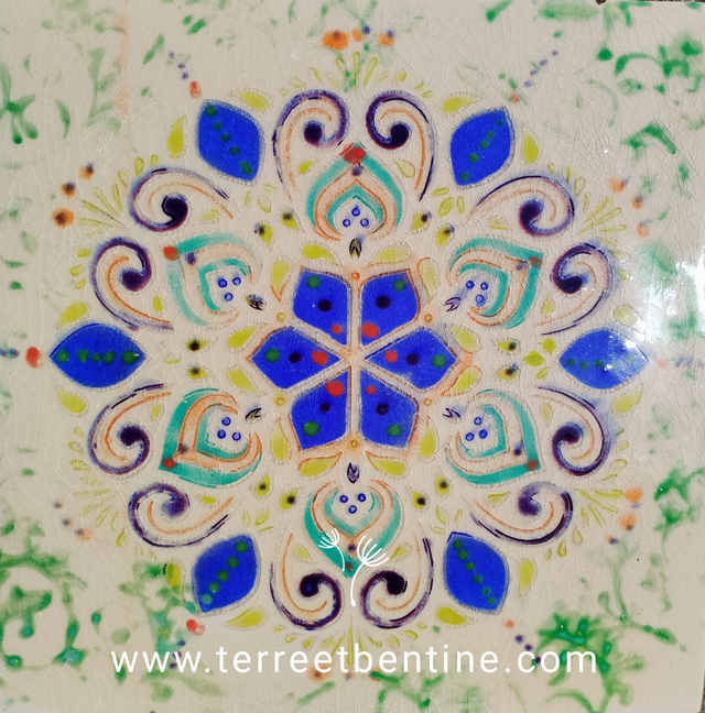 Carreau en faïence - Cuisson à 1000°C (ne résiste pas aux intempéries comme le gel...) Motif en forme de MANDALA - décoré et peint à la main durant la période du confinement. 22 x 22 cm
