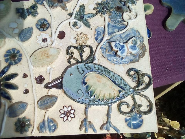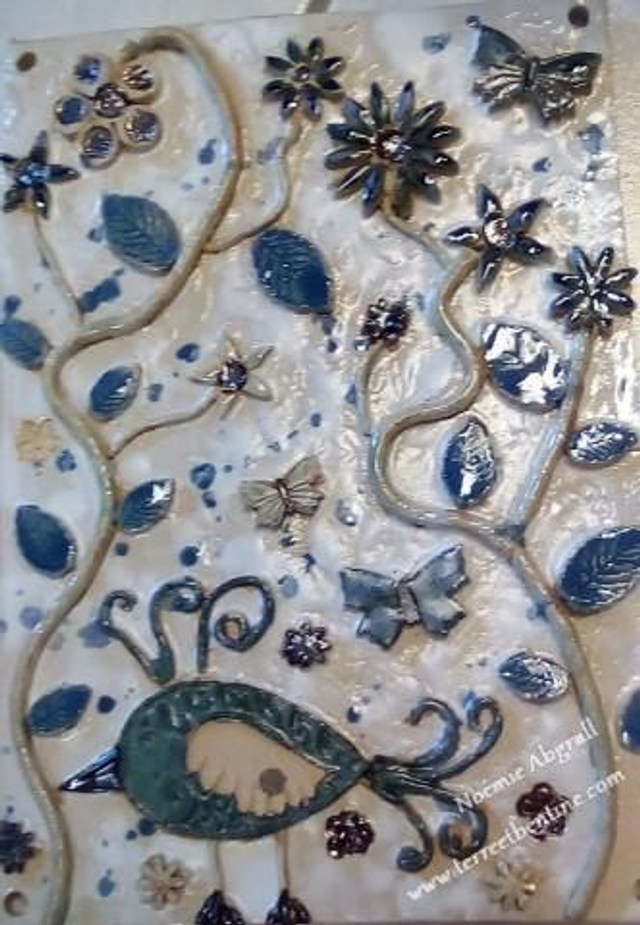 décors oiseau et fleurs en bas relief, sur fond émaillé blanc